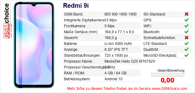 Hast du eigene Webseite? Willst du die Informationen über Standarddaten des Handys Redmi 9i irgendwo veröffentlichen? Das ist sehr einfach. Du kannst das Bild herunterladen oder kopieren und auf der Webseite folgenden Code hinzufügen:Das Einfügen von diesem Code verursacht das Anzeigen von dem folgenden Bild: