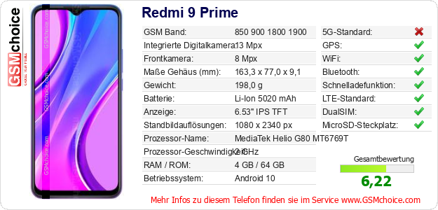 Hast du eigene Webseite? Willst du die Informationen über Standarddaten des Handys Redmi 9 Prime irgendwo veröffentlichen? Das ist sehr einfach. Du kannst das Bild herunterladen oder kopieren und auf der Webseite folgenden Code hinzufügen:Das Einfügen von diesem Code verursacht das Anzeigen von dem folgenden Bild: