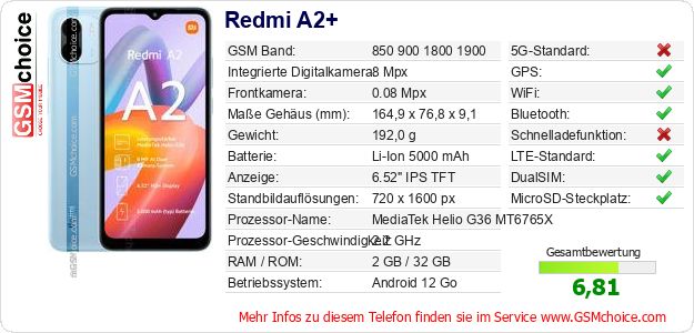 Hast du eigene Webseite? Willst du die Informationen über Standarddaten des Handys Redmi A2+ irgendwo veröffentlichen? Das ist sehr einfach. Du kannst das Bild herunterladen oder kopieren und auf der Webseite folgenden Code hinzufügen:Das Einfügen von diesem Code verursacht das Anzeigen von dem folgenden Bild: