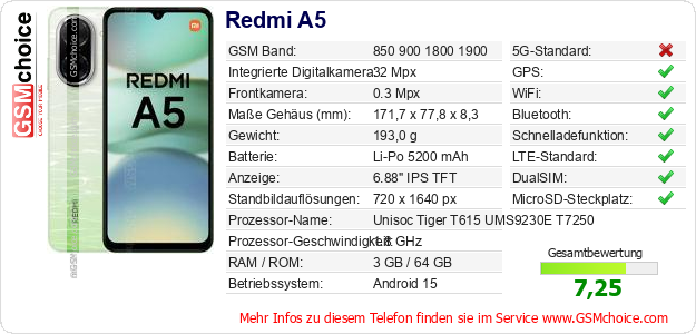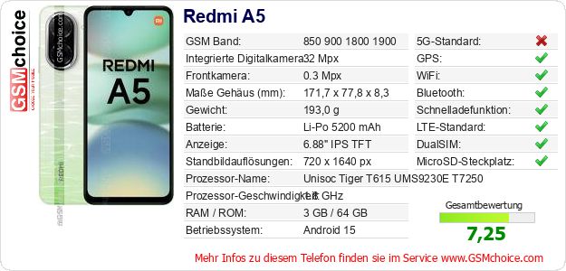 Hast du eigene Webseite? Willst du die Informationen über Standarddaten des Handys Redmi A5 irgendwo veröffentlichen? Das ist sehr einfach. Du kannst das Bild herunterladen oder kopieren und auf der Webseite folgenden Code hinzufügen:Das Einfügen von diesem Code verursacht das Anzeigen von dem folgenden Bild: