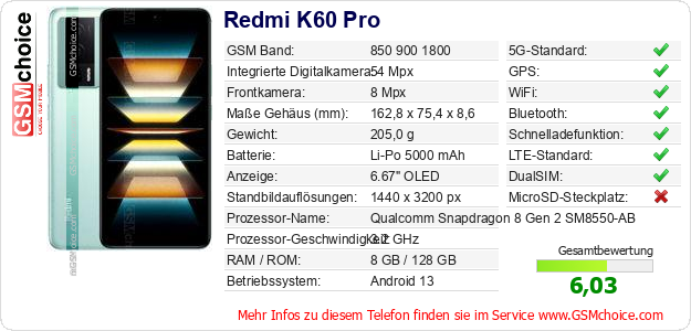 Hast du eigene Webseite? Willst du die Informationen über Standarddaten des Handys Redmi K60 Pro irgendwo veröffentlichen? Das ist sehr einfach. Du kannst das Bild herunterladen oder kopieren und auf der Webseite folgenden Code hinzufügen:Das Einfügen von diesem Code verursacht das Anzeigen von dem folgenden Bild: