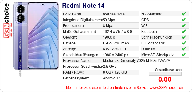 Hast du eigene Webseite? Willst du die Informationen über Standarddaten des Handys Redmi Note 14 irgendwo veröffentlichen? Das ist sehr einfach. Du kannst das Bild herunterladen oder kopieren und auf der Webseite folgenden Code hinzufügen:Das Einfügen von diesem Code verursacht das Anzeigen von dem folgenden Bild: