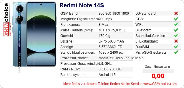 Hast du eigene Webseite? Willst du die Informationen über Standarddaten des Handys Redmi Note 14S irgendwo veröffentlichen? Das ist sehr einfach. Du kannst das Bild herunterladen oder kopieren und auf der Webseite folgenden Code hinzufügen:Das Einfügen von diesem Code verursacht das Anzeigen von dem folgenden Bild: