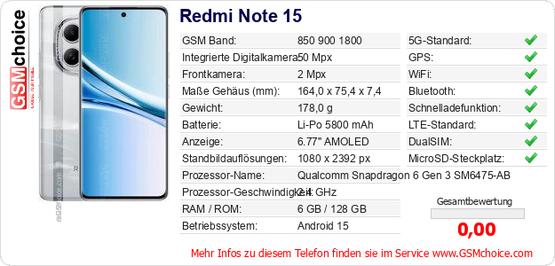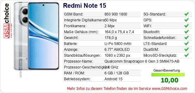 Hast du eigene Webseite? Willst du die Informationen über Standarddaten des Handys Redmi Note 15 irgendwo veröffentlichen? Das ist sehr einfach. Du kannst das Bild herunterladen oder kopieren und auf der Webseite folgenden Code hinzufügen:Das Einfügen von diesem Code verursacht das Anzeigen von dem folgenden Bild: