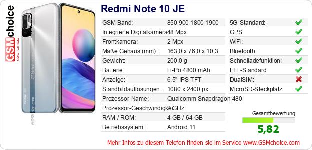 Hast du eigene Webseite? Willst du die Informationen über Standarddaten des Handys Redmi Note 10 JE irgendwo veröffentlichen? Das ist sehr einfach. Du kannst das Bild herunterladen oder kopieren und auf der Webseite folgenden Code hinzufügen:Das Einfügen von diesem Code verursacht das Anzeigen von dem folgenden Bild: