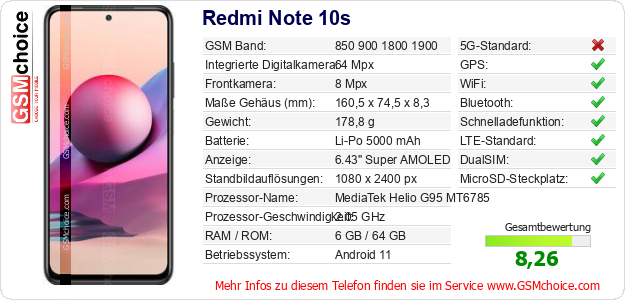 Hast du eigene Webseite? Willst du die Informationen über Standarddaten des Handys Redmi Note 10s irgendwo veröffentlichen? Das ist sehr einfach. Du kannst das Bild herunterladen oder kopieren und auf der Webseite folgenden Code hinzufügen:Das Einfügen von diesem Code verursacht das Anzeigen von dem folgenden Bild: