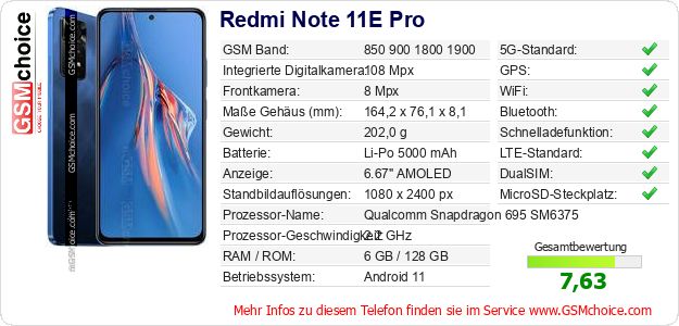 Hast du eigene Webseite? Willst du die Informationen über Standarddaten des Handys Redmi Note 11E Pro irgendwo veröffentlichen? Das ist sehr einfach. Du kannst das Bild herunterladen oder kopieren und auf der Webseite folgenden Code hinzufügen:Das Einfügen von diesem Code verursacht das Anzeigen von dem folgenden Bild: