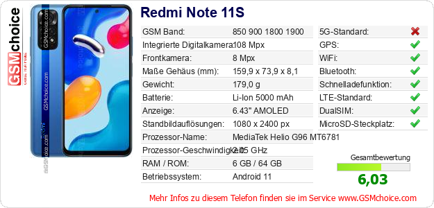 Hast du eigene Webseite? Willst du die Informationen über Standarddaten des Handys Redmi Note 11S irgendwo veröffentlichen? Das ist sehr einfach. Du kannst das Bild herunterladen oder kopieren und auf der Webseite folgenden Code hinzufügen:Das Einfügen von diesem Code verursacht das Anzeigen von dem folgenden Bild: