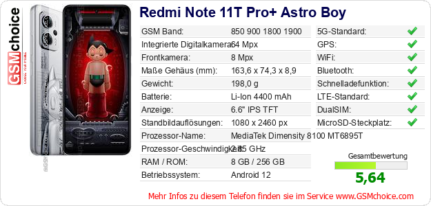 Hast du eigene Webseite? Willst du die Informationen über Standarddaten des Handys Redmi Note 11T Pro+ Astro Boy irgendwo veröffentlichen? Das ist sehr einfach. Du kannst das Bild herunterladen oder kopieren und auf der Webseite folgenden Code hinzufügen:Das Einfügen von diesem Code verursacht das Anzeigen von dem folgenden Bild: