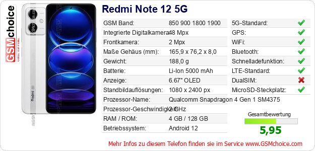 Hast du eigene Webseite? Willst du die Informationen über Standarddaten des Handys Redmi Note 12 5G irgendwo veröffentlichen? Das ist sehr einfach. Du kannst das Bild herunterladen oder kopieren und auf der Webseite folgenden Code hinzufügen:Das Einfügen von diesem Code verursacht das Anzeigen von dem folgenden Bild: