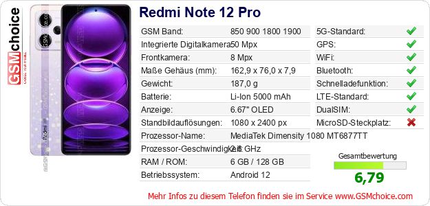 Hast du eigene Webseite? Willst du die Informationen über Standarddaten des Handys Redmi Note 12 Pro irgendwo veröffentlichen? Das ist sehr einfach. Du kannst das Bild herunterladen oder kopieren und auf der Webseite folgenden Code hinzufügen:Das Einfügen von diesem Code verursacht das Anzeigen von dem folgenden Bild: