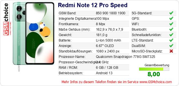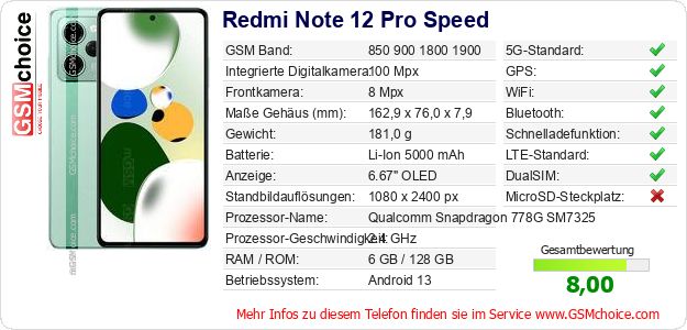 Hast du eigene Webseite? Willst du die Informationen über Standarddaten des Handys Redmi Note 12 Pro Speed irgendwo veröffentlichen? Das ist sehr einfach. Du kannst das Bild herunterladen oder kopieren und auf der Webseite folgenden Code hinzufügen:Das Einfügen von diesem Code verursacht das Anzeigen von dem folgenden Bild: