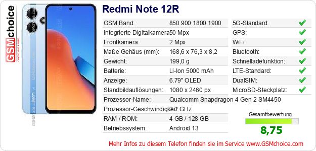 Hast du eigene Webseite? Willst du die Informationen über Standarddaten des Handys Redmi Note 12R irgendwo veröffentlichen? Das ist sehr einfach. Du kannst das Bild herunterladen oder kopieren und auf der Webseite folgenden Code hinzufügen:Das Einfügen von diesem Code verursacht das Anzeigen von dem folgenden Bild: