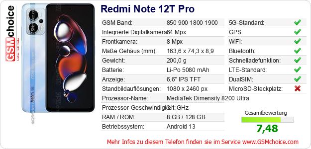 Hast du eigene Webseite? Willst du die Informationen über Standarddaten des Handys Redmi Note 12T Pro irgendwo veröffentlichen? Das ist sehr einfach. Du kannst das Bild herunterladen oder kopieren und auf der Webseite folgenden Code hinzufügen:Das Einfügen von diesem Code verursacht das Anzeigen von dem folgenden Bild: