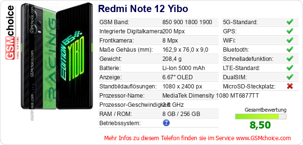 Hast du eigene Webseite? Willst du die Informationen über Standarddaten des Handys Redmi Note 12 Yibo irgendwo veröffentlichen? Das ist sehr einfach. Du kannst das Bild herunterladen oder kopieren und auf der Webseite folgenden Code hinzufügen:Das Einfügen von diesem Code verursacht das Anzeigen von dem folgenden Bild: