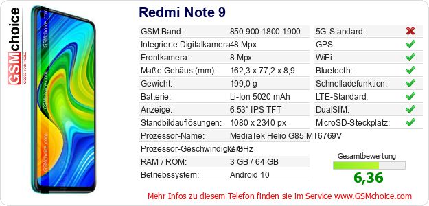 Hast du eigene Webseite? Willst du die Informationen über Standarddaten des Handys Redmi Note 9 irgendwo veröffentlichen? Das ist sehr einfach. Du kannst das Bild herunterladen oder kopieren und auf der Webseite folgenden Code hinzufügen:Das Einfügen von diesem Code verursacht das Anzeigen von dem folgenden Bild: