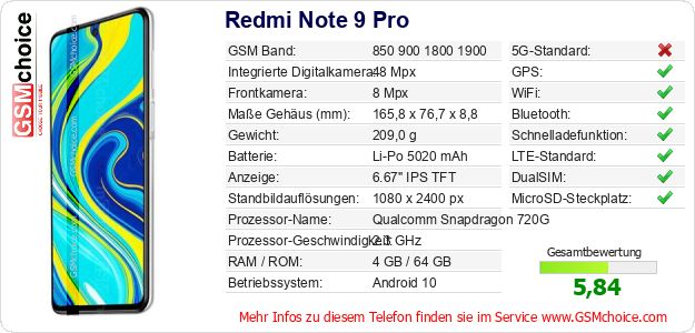 Hast du eigene Webseite? Willst du die Informationen über Standarddaten des Handys Redmi Note 9 Pro irgendwo veröffentlichen? Das ist sehr einfach. Du kannst das Bild herunterladen oder kopieren und auf der Webseite folgenden Code hinzufügen:Das Einfügen von diesem Code verursacht das Anzeigen von dem folgenden Bild: