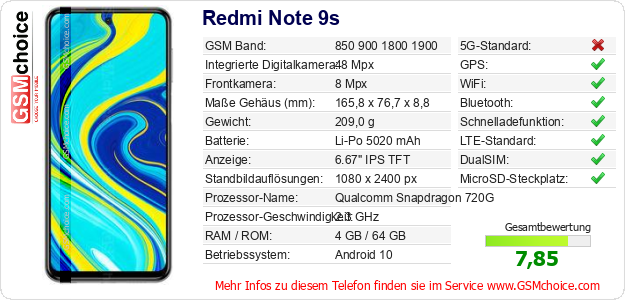 Hast du eigene Webseite? Willst du die Informationen über Standarddaten des Handys Redmi Note 9s irgendwo veröffentlichen? Das ist sehr einfach. Du kannst das Bild herunterladen oder kopieren und auf der Webseite folgenden Code hinzufügen:Das Einfügen von diesem Code verursacht das Anzeigen von dem folgenden Bild: