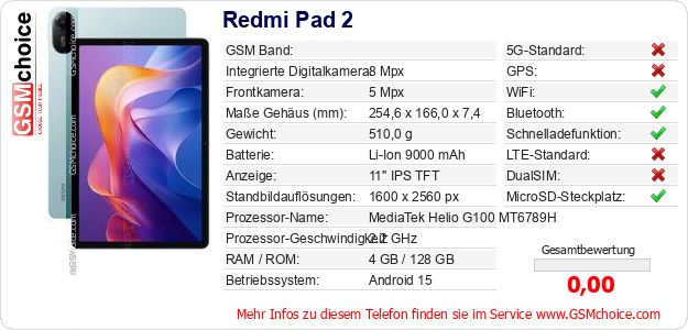 Hast du eigene Webseite? Willst du die Informationen über Standarddaten des Handys Redmi Pad 2 irgendwo veröffentlichen? Das ist sehr einfach. Du kannst das Bild herunterladen oder kopieren und auf der Webseite folgenden Code hinzufügen:Das Einfügen von diesem Code verursacht das Anzeigen von dem folgenden Bild:
