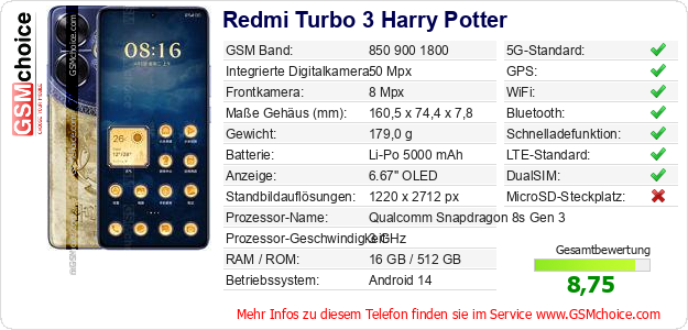 Hast du eigene Webseite? Willst du die Informationen über Standarddaten des Handys Redmi Turbo 3 Harry Potter irgendwo veröffentlichen? Das ist sehr einfach. Du kannst das Bild herunterladen oder kopieren und auf der Webseite folgenden Code hinzufügen:Das Einfügen von diesem Code verursacht das Anzeigen von dem folgenden Bild: