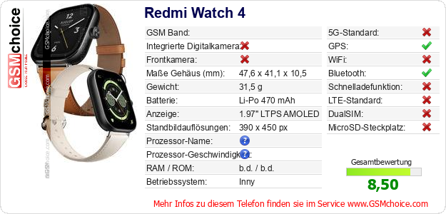 Hast du eigene Webseite? Willst du die Informationen über Standarddaten des Handys Redmi Watch 4 irgendwo veröffentlichen? Das ist sehr einfach. Du kannst das Bild herunterladen oder kopieren und auf der Webseite folgenden Code hinzufügen:Das Einfügen von diesem Code verursacht das Anzeigen von dem folgenden Bild: