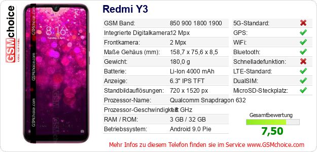 Hast du eigene Webseite? Willst du die Informationen über Standarddaten des Handys Redmi Y3 irgendwo veröffentlichen? Das ist sehr einfach. Du kannst das Bild herunterladen oder kopieren und auf der Webseite folgenden Code hinzufügen:Das Einfügen von diesem Code verursacht das Anzeigen von dem folgenden Bild: