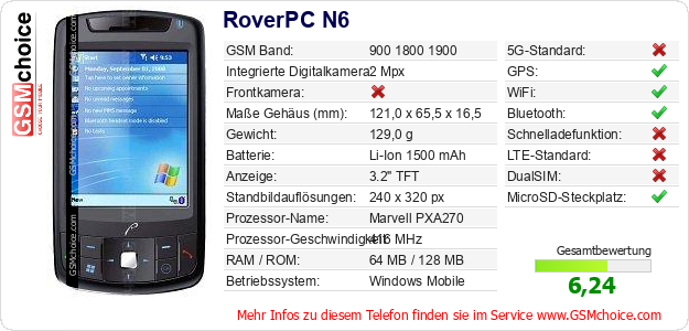 Hast du eigene Webseite? Willst du die Informationen über Standarddaten des Handys RoverPC N6 irgendwo veröffentlichen? Das ist sehr einfach. Du kannst das Bild herunterladen oder kopieren und auf der Webseite folgenden Code hinzufügen:Das Einfügen von diesem Code verursacht das Anzeigen von dem folgenden Bild: