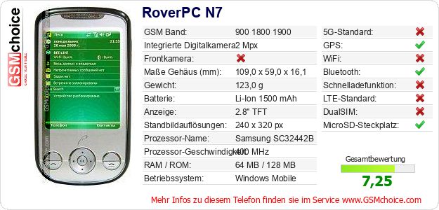 Daten des Mobiltelefons RoverPC N7 auf Ihrer Seite