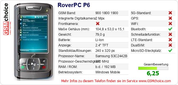 Daten des Mobiltelefons RoverPC P6 auf Ihrer Seite