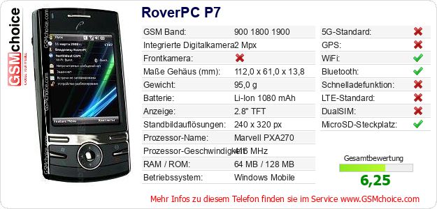 Daten des Mobiltelefons RoverPC P7 auf Ihrer Seite