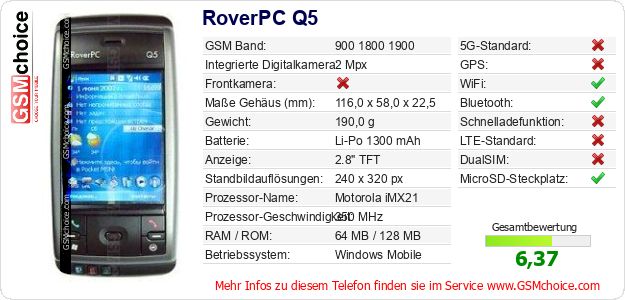 Daten des Mobiltelefons RoverPC Q5 auf Ihrer Seite
