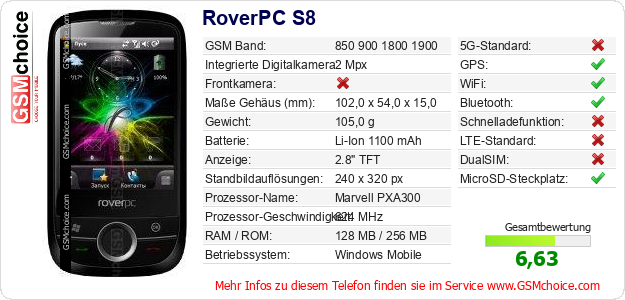 Daten des Mobiltelefons RoverPC S8 auf Ihrer Seite