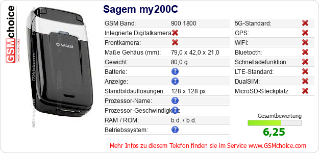 Hast du eigene Webseite? Willst du die Informationen über Standarddaten des Handys Sagem my200C irgendwo veröffentlichen? Das ist sehr einfach. Du kannst das Bild herunterladen oder kopieren und auf der Webseite folgenden Code hinzufügen:Das Einfügen von diesem Code verursacht das Anzeigen von dem folgenden Bild: