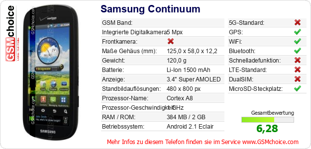 Hast du eigene Webseite? Willst du die Informationen über Standarddaten des Handys Samsung Continuum irgendwo veröffentlichen? Das ist sehr einfach. Du kannst das Bild herunterladen oder kopieren und auf der Webseite folgenden Code hinzufügen:Das Einfügen von diesem Code verursacht das Anzeigen von dem folgenden Bild: