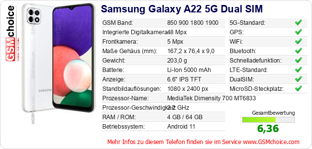 Daten des Mobiltelefons Samsung Galaxy A22 5G Dual SIM auf Ihrer Seite