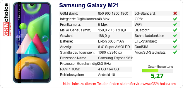 Hast du eigene Webseite? Willst du die Informationen über Standarddaten des Handys Samsung Galaxy M21 irgendwo veröffentlichen? Das ist sehr einfach. Du kannst das Bild herunterladen oder kopieren und auf der Webseite folgenden Code hinzufügen:Das Einfügen von diesem Code verursacht das Anzeigen von dem folgenden Bild: