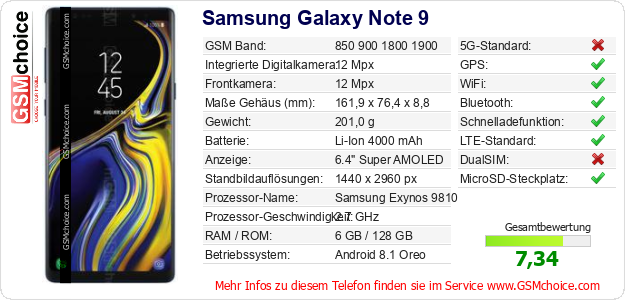 Hast du eigene Webseite? Willst du die Informationen über Standarddaten des Handys Samsung Galaxy Note 9 irgendwo veröffentlichen? Das ist sehr einfach. Du kannst das Bild herunterladen oder kopieren und auf der Webseite folgenden Code hinzufügen:Das Einfügen von diesem Code verursacht das Anzeigen von dem folgenden Bild: