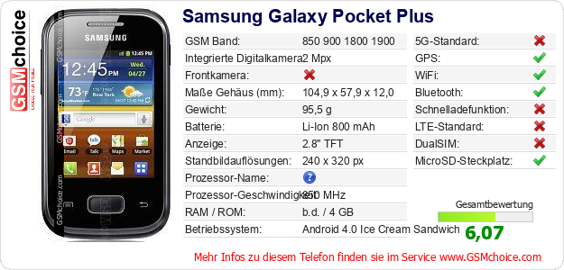 Hast du eigene Webseite? Willst du die Informationen über Standarddaten des Handys Samsung Galaxy Pocket Plus irgendwo veröffentlichen? Das ist sehr einfach. Du kannst das Bild herunterladen oder kopieren und auf der Webseite folgenden Code hinzufügen:Das Einfügen von diesem Code verursacht das Anzeigen von dem folgenden Bild: