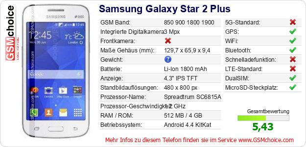 Hast du eigene Webseite? Willst du die Informationen über Standarddaten des Handys Samsung Galaxy Star 2 Plus irgendwo veröffentlichen? Das ist sehr einfach. Du kannst das Bild herunterladen oder kopieren und auf der Webseite folgenden Code hinzufügen:Das Einfügen von diesem Code verursacht das Anzeigen von dem folgenden Bild: