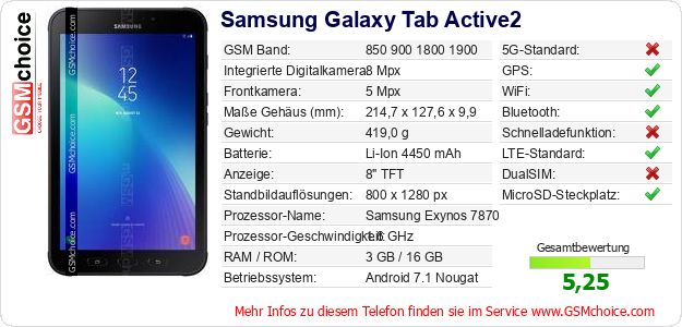 Hast du eigene Webseite? Willst du die Informationen über Standarddaten des Handys Samsung Galaxy Tab Active2 irgendwo veröffentlichen? Das ist sehr einfach. Du kannst das Bild herunterladen oder kopieren und auf der Webseite folgenden Code hinzufügen:Das Einfügen von diesem Code verursacht das Anzeigen von dem folgenden Bild: