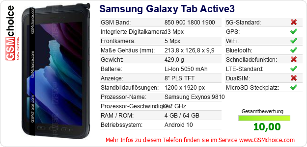 Hast du eigene Webseite? Willst du die Informationen über Standarddaten des Handys Samsung Galaxy Tab Active3 irgendwo veröffentlichen? Das ist sehr einfach. Du kannst das Bild herunterladen oder kopieren und auf der Webseite folgenden Code hinzufügen:Das Einfügen von diesem Code verursacht das Anzeigen von dem folgenden Bild: