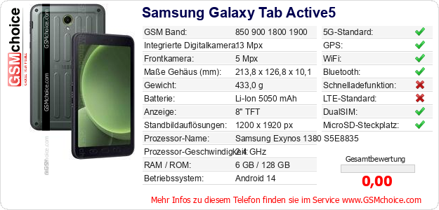 Hast du eigene Webseite? Willst du die Informationen über Standarddaten des Handys Samsung Galaxy Tab Active5 irgendwo veröffentlichen? Das ist sehr einfach. Du kannst das Bild herunterladen oder kopieren und auf der Webseite folgenden Code hinzufügen:Das Einfügen von diesem Code verursacht das Anzeigen von dem folgenden Bild:
