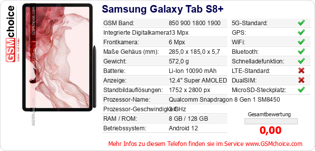 Hast du eigene Webseite? Willst du die Informationen über Standarddaten des Handys Samsung Galaxy Tab S8+ irgendwo veröffentlichen? Das ist sehr einfach. Du kannst das Bild herunterladen oder kopieren und auf der Webseite folgenden Code hinzufügen:Das Einfügen von diesem Code verursacht das Anzeigen von dem folgenden Bild: