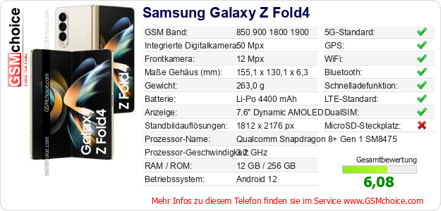 Hast du eigene Webseite? Willst du die Informationen über Standarddaten des Handys Samsung Galaxy Z Fold4 irgendwo veröffentlichen? Das ist sehr einfach. Du kannst das Bild herunterladen oder kopieren und auf der Webseite folgenden Code hinzufügen:Das Einfügen von diesem Code verursacht das Anzeigen von dem folgenden Bild: