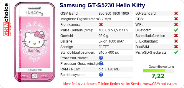 Hast du eigene Webseite? Willst du die Informationen über Standarddaten des Handys Samsung GT-S5230 Hello Kitty irgendwo veröffentlichen? Das ist sehr einfach. Du kannst das Bild herunterladen oder kopieren und auf der Webseite folgenden Code hinzufügen:Das Einfügen von diesem Code verursacht das Anzeigen von dem folgenden Bild: