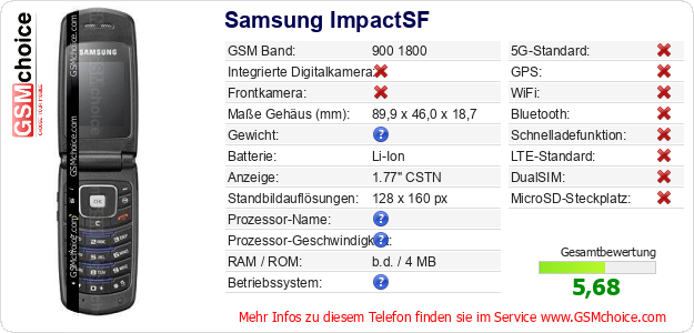 Hast du eigene Webseite? Willst du die Informationen über Standarddaten des Handys Samsung ImpactSF irgendwo veröffentlichen? Das ist sehr einfach. Du kannst das Bild herunterladen oder kopieren und auf der Webseite folgenden Code hinzufügen:Das Einfügen von diesem Code verursacht das Anzeigen von dem folgenden Bild: