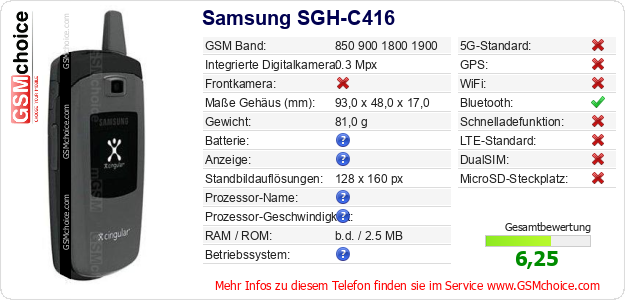 Hast du eigene Webseite? Willst du die Informationen über Standarddaten des Handys Samsung SGH-C416 irgendwo veröffentlichen? Das ist sehr einfach. Du kannst das Bild herunterladen oder kopieren und auf der Webseite folgenden Code hinzufügen:Das Einfügen von diesem Code verursacht das Anzeigen von dem folgenden Bild: