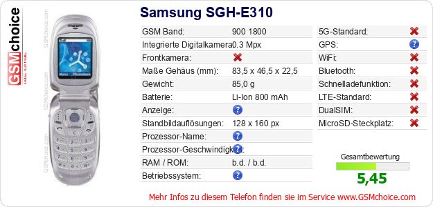 Hast du eigene Webseite? Willst du die Informationen über Standarddaten des Handys Samsung SGH-E310 irgendwo veröffentlichen? Das ist sehr einfach. Du kannst das Bild herunterladen oder kopieren und auf der Webseite folgenden Code hinzufügen:Das Einfügen von diesem Code verursacht das Anzeigen von dem folgenden Bild: