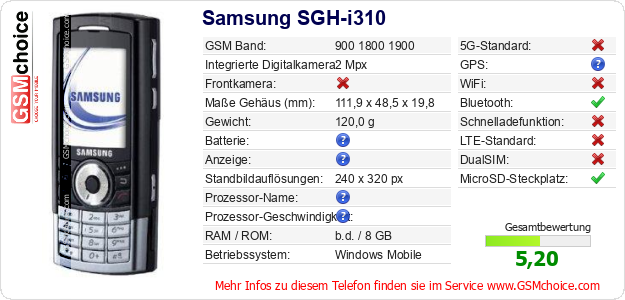 Hast du eigene Webseite? Willst du die Informationen über Standarddaten des Handys Samsung SGH-i310 irgendwo veröffentlichen? Das ist sehr einfach. Du kannst das Bild herunterladen oder kopieren und auf der Webseite folgenden Code hinzufügen:Das Einfügen von diesem Code verursacht das Anzeigen von dem folgenden Bild: