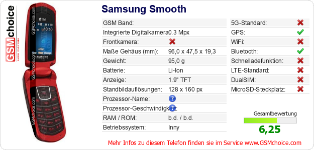 Hast du eigene Webseite? Willst du die Informationen über Standarddaten des Handys Samsung Smooth irgendwo veröffentlichen? Das ist sehr einfach. Du kannst das Bild herunterladen oder kopieren und auf der Webseite folgenden Code hinzufügen:Das Einfügen von diesem Code verursacht das Anzeigen von dem folgenden Bild: